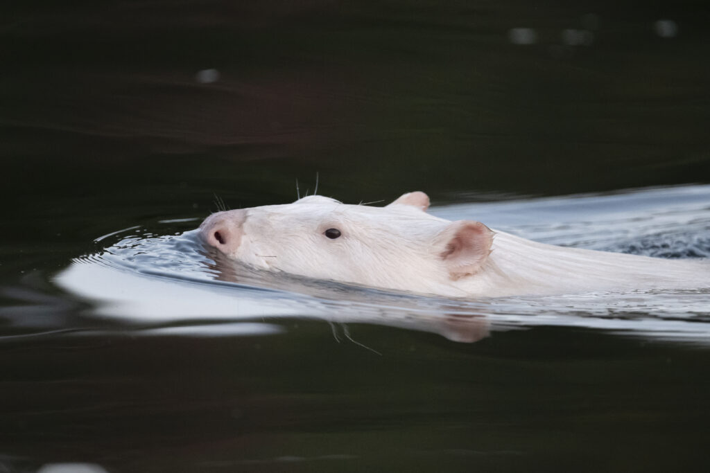 A leucistic beaver gliding through calm water