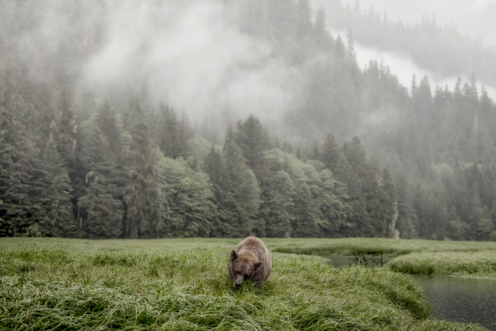 A grizzly bear feeding in coastal grasslands